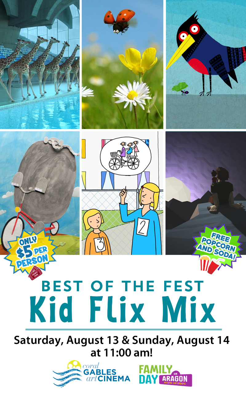The New York International Children’s Film Festival and the Miami International Film Festival returns to Coral Gables with the award-winning collection of short films, the Kid Flix Mix, a perfect treat for young children on Saturday, August 13 & Sunday, August 14, 2016 during our Family Day on Aragon series! A group of musically inclined ants face off against a lumberjack threatening to take down their tree in Pik Pik Pik. Being different isn’t so bad in Bunny New Girl and Zebra. Sometimes even our family members can feel like strangers in My Big Brother, Eyes, and Oscar nominated Me and my Moulton. Fantasies create new worlds and endless possibilities in 5.80 Meters, Larisa Can Fly, and Submarine Sandwich. One special object can inspire anyone, big or small, in The Elephant and the Bicycle and Cookie-Tin Banjo, and a fly and a spider go to war in a common bathroom in Minuscule: The Private Life of Insects – Brushing. These short films are appropriate for ages 3 and up.